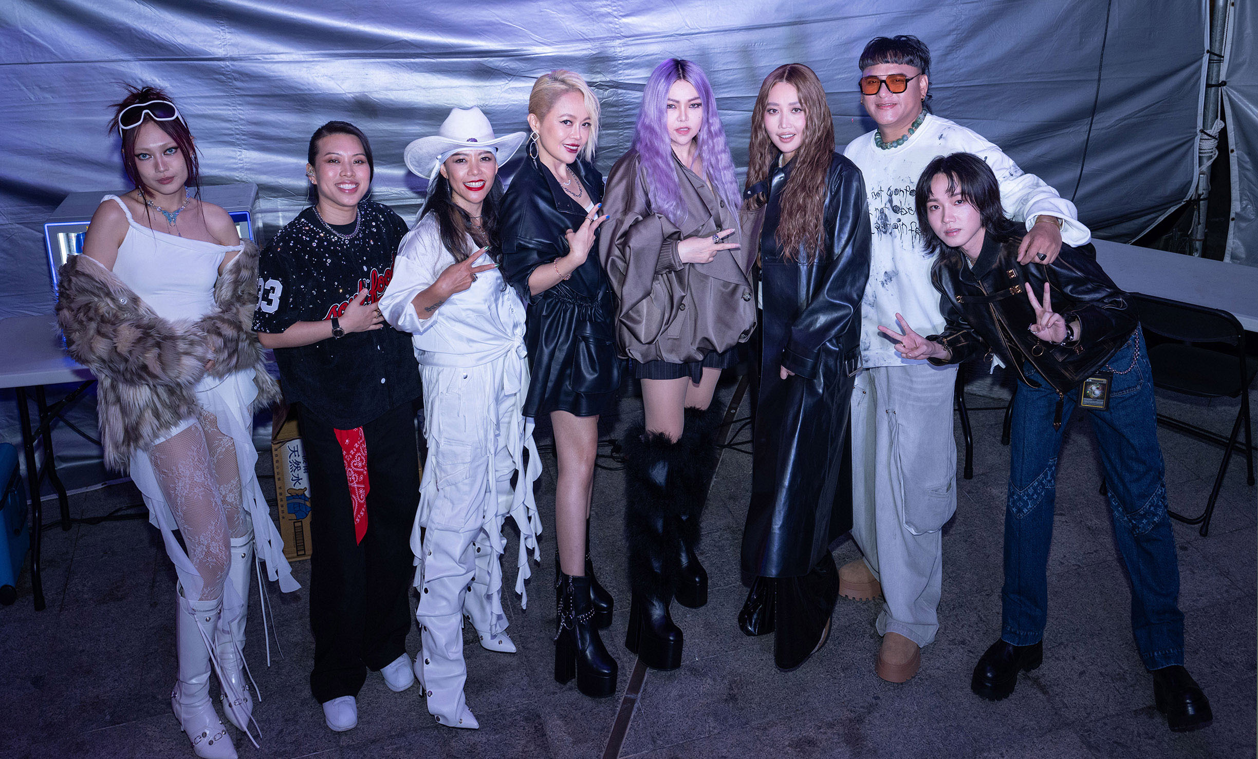 張惠妹(右四)坐鎮台東,與持修(右起)、桑布伊、A-Lin、戴愛玲、Saya、葛仲珊、琟娜VERNA在後台玩得很開心。圖/台東縣政府提供