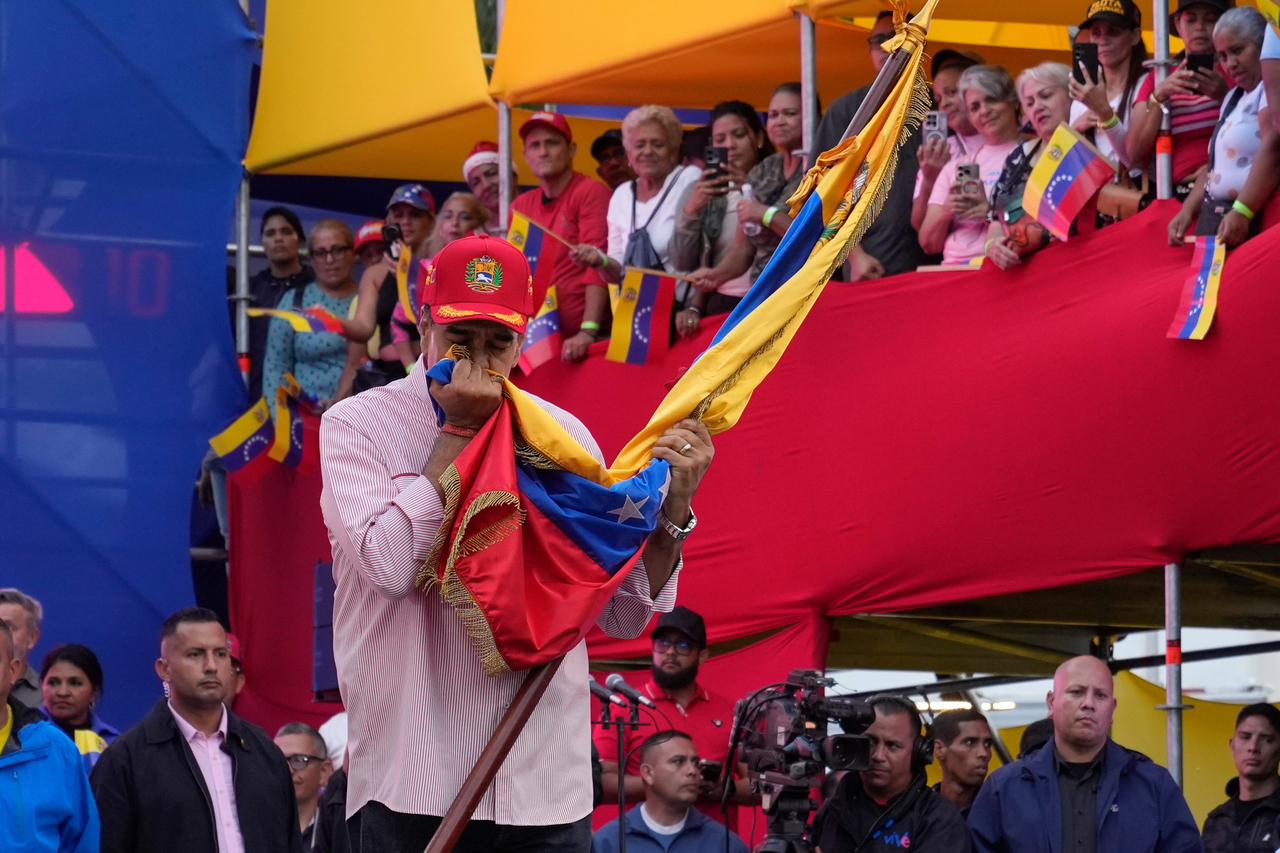 圖為委內瑞拉前總統馬杜洛1日在首都的公開活動上,親吻委內瑞拉國旗。(美聯社)