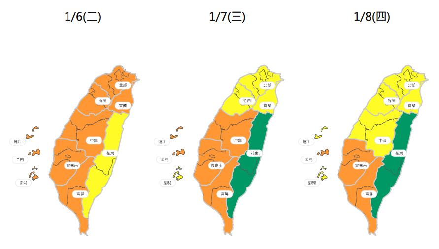 周四持續受強烈大陸冷氣團影響,環境風場為偏北風至東北風,偏北風仍可能挾帶微量境外汙染物移入,中南部位於下風處,汙染物易累積。花東空品區為「良好」等級;北部、竹苗、中部、宜蘭空品區及馬祖、澎湖為「普通」等級;雲嘉南、高屏空品區及金門為「橘色提醒」等級。