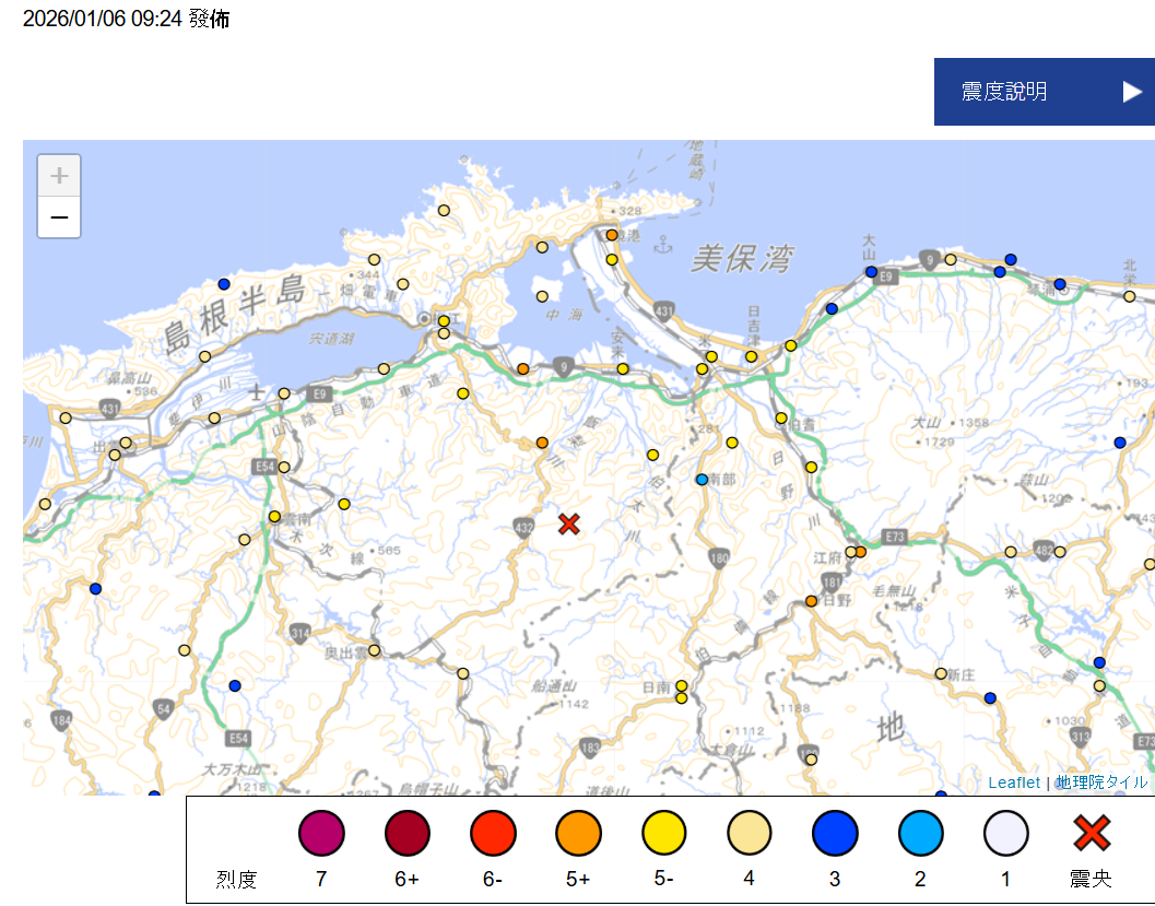 氣象廳指出,這是鳥取縣與島根縣分別於2016年與2018年,再度觀測到震度5強的搖晃。