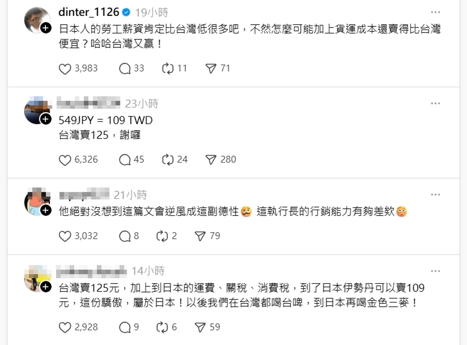 眾人紛紛留言狠批:「台灣人專坑台灣人」「謝謝算數達人。難過到以後不會買三麥了」「以後我們在台灣都喝台啤,到日本再喝金色三麥!」還有人酸:「可能台灣薪水比日本高,所以物價比人家貴也是可以理解的」「以後會記得不買你家的酒了 不然都被當盤子」;但也有人認為,定價不一定是執行長的問題,「台灣通路業者不讓利也不是一天兩天的事」,也有人推測可能是關稅差異,並分析台灣在通路折扣後價格其實差不多。