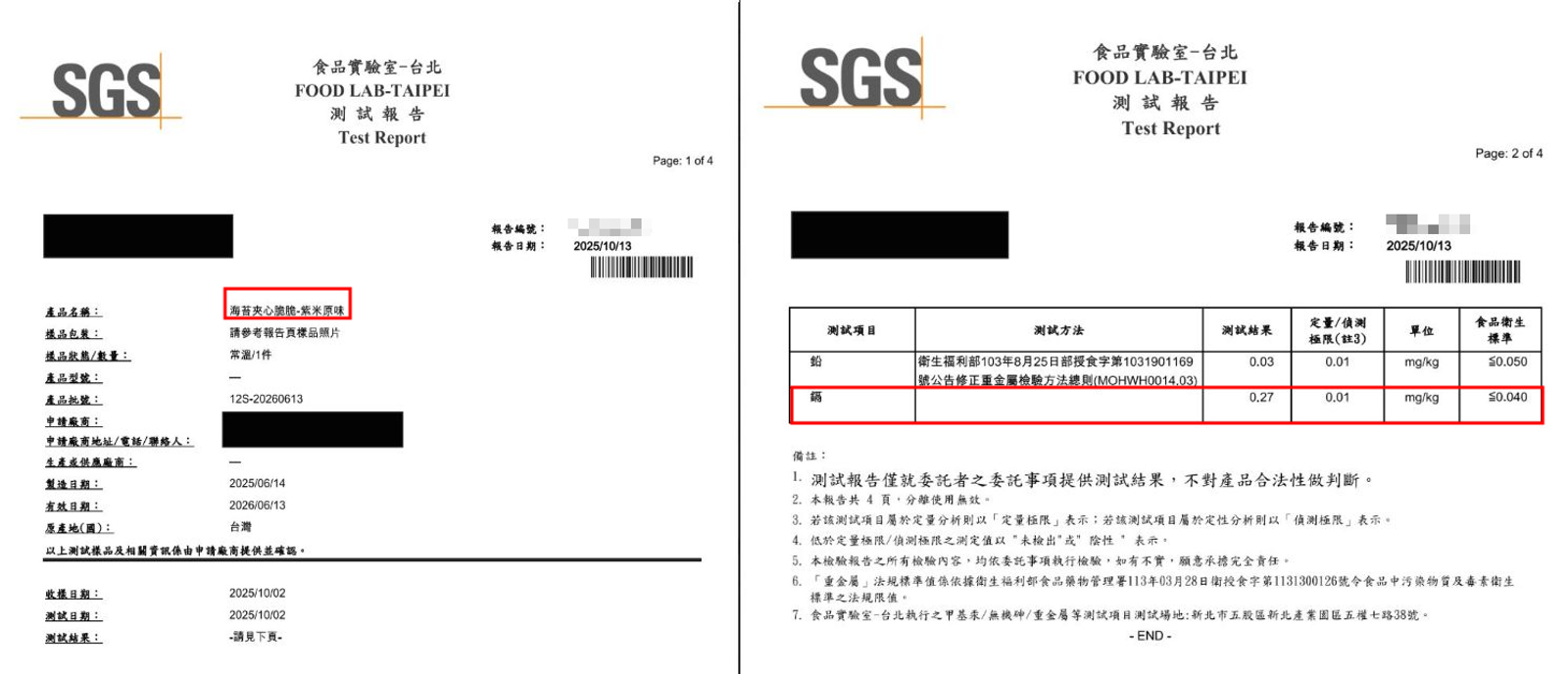 本刊除取得投訴人自行送驗SGS的報告外,另也陪同投訴人送驗其他產品給SGS檢驗,證實這些食品鉛含量超標程度從1.4倍至4.4倍不等;鎘含量部分更是超標22倍至53倍。報導刊登後,也引發不少家長關切。