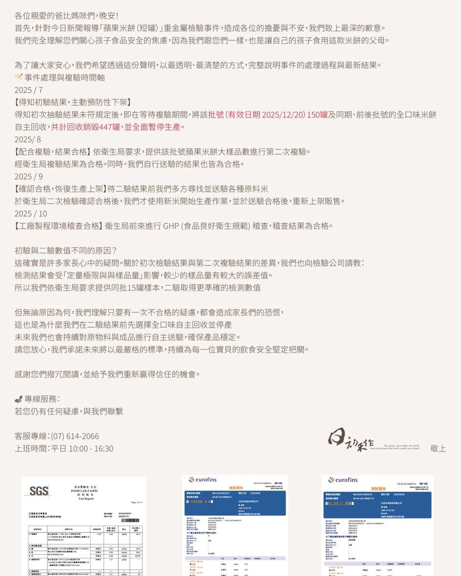 另本刊在檢驗報告中也發現,「日初禾作菠菜糙米餅」驗出鎘含量0.06毫克/公斤,超標1.5倍;以及「日初禾作番茄糙米餅」檢出鎘含量0.08毫克/公斤,超標2倍。本刊調查,行政院消保處先前檢出重金屬含量超標的產品中,就包含「日初禾作零添加蘋果糙米餅」,當時檢出鎘含量為0.049 毫克/公斤,超標1.22倍。