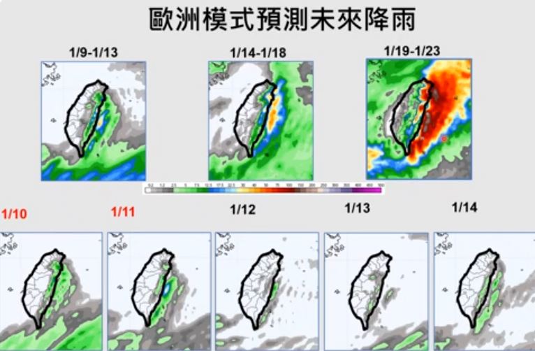 賈新興指出,下周六午後桃園以北山區、大臺北東側、基宜花和臺東山區有局部短暫雨;也提醒,短期氣候趨勢預測顯示,1月下旬起至2月中旬,宜蘭降雨仍以偏多的機率較高, 其他地區降雨相對以偏少的機率較高。