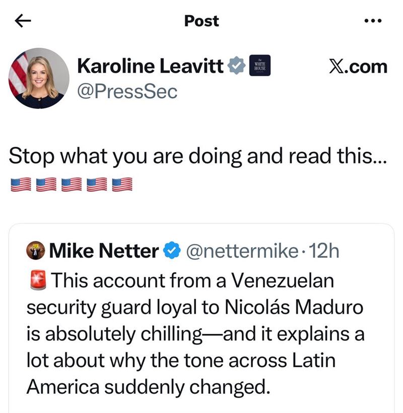這場突襲行動最驚悚的一面,並非來自國防部的官方簡報,而是來自白宮新聞秘書卡羅琳·利維特(Karoline Leavitt)的親自轉貼。週六,利維特在社群平台 X(前推特)上轉發了一則來自馬杜洛前親信衛兵的目擊證詞,並嚴肅地寫下:「停下你手邊正在做的事,讀讀這個……(Stop what you are doing and read this…)」配上了五面美國國旗,暗示了官方對這份證詞的默認與自豪。
