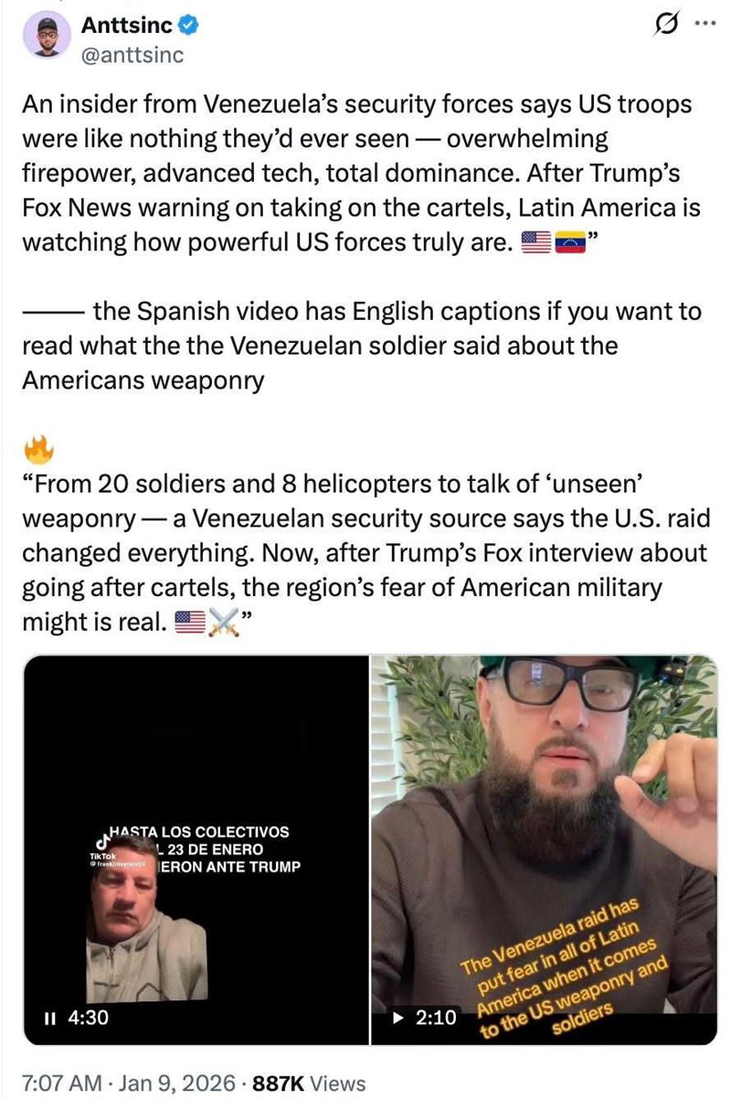 「他們(美軍)擁有的科技太先進了,這不是我們以前對抗過的任何東西,」衛兵顫抖地說。據他估算,美軍僅出動了約 8 架直升機、投放了大概 20 名士兵,就在沒有折損任何一人的情況下(註:此為衛兵視角,美方後續證實有人員受傷),徹底瓦解了數百人的防線。這種壓倒性的恐懼,解釋了為何拉丁美洲的反美聲浪在一夜之間突然安靜了下來。