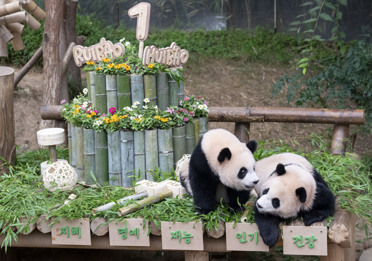 南韓總統李在明向習近平請求再商借一對貓熊。圖為2024年7月7日在南韓愛寶樂園誕生的雙胞胎貓熊「睿寶」和「輝寶」一周歲生日,園方為牠們舉行慶生活動。(中新社)