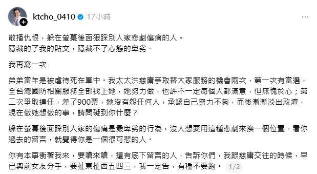 卓冠廷發現後,截圖另發一篇文章向網友喊話,卓冠廷說,散播仇恨,躲在螢幕踩別人家悲劇傷痛的人,雖然可以隱藏貼文,但隱藏不了心態的卑劣。卓冠廷說,當年弟弟被虐死在軍中,太太爭取替大家服務的機會兩次,第一次當選後,全台灣國防相關服務全部找上她,雖然無法做到人人滿意,但也無愧於心。