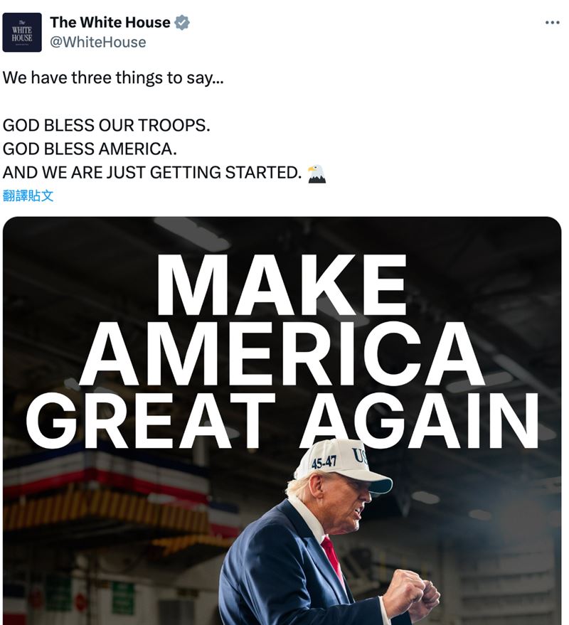 白宮於美國時間11日下午突然在X平台發文,表示「我們有三件事要說」,接著就喊話「願上帝保佑我們的軍隊,願上帝保佑美國,我們才剛要開始」(GOD BLESS OUR TROOPS. GOD BLESS AMERICA. AND WE ARE JUST GETTING STARTED)。貼文中的照片,川普緊握雙拳看起來相當振奮,背景則是美軍基地照片。