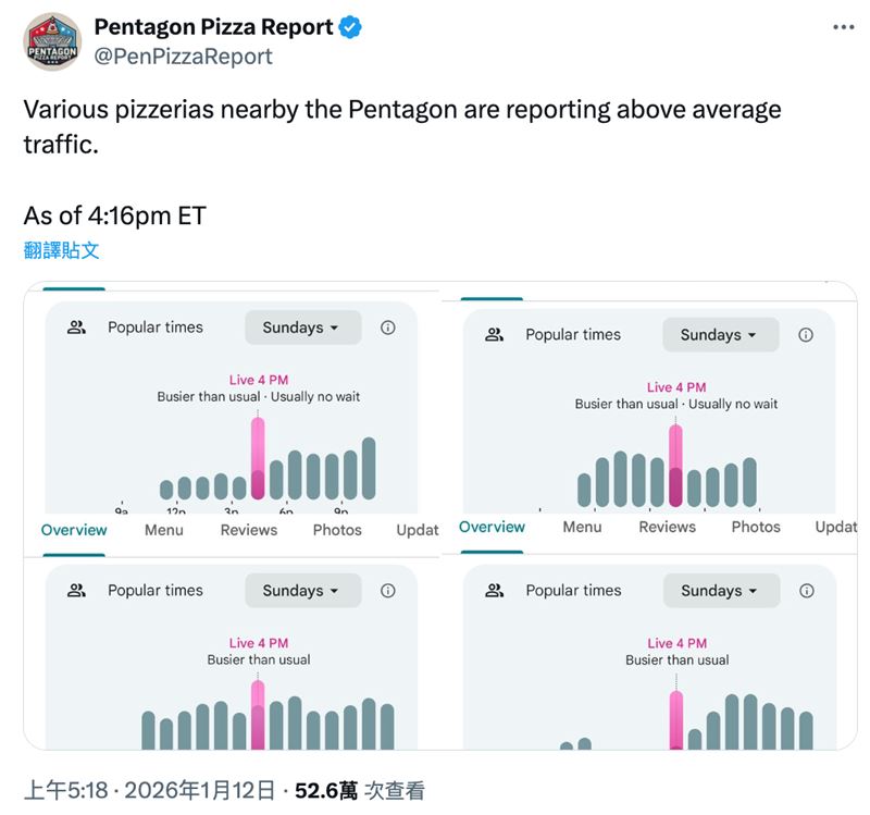 除了白宮發文引發猜測,根據非官方情報追蹤帳號「五角大廈披薩觀測」(@PenPizzaReport)報告,美東時間 11日下午4時16分,五角大廈方圓 2 英里內的連鎖披薩店(如 Pizzato Pizza、達美樂)訂單量出現異常飆升,皆高出正常水準。「披薩指數」被視為美軍官員正「熬夜加班」處理重大決策,1991 年波斯灣戰爭前夕,以及先前活捉馬杜洛的「絕對決心行動」前(當時訂單成長 770%),皆曾出現類似的訂單暴增。
