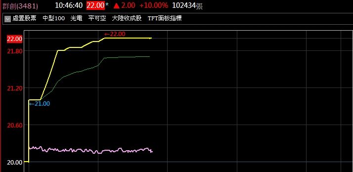 群創遭「關禁閉」照樣噴漲停!營收創45個月新高群創(3481)近期因股價波動劇烈,自1月7日起至20日遭列入5分鐘一盤的分盤交易(處置股),雖然先前連收兩天黑K,但今日不畏「關禁閉」強勢回神,一開盤就震盪走高,盤中更直接衝上22元漲停鎖死,展現驚人氣勢。