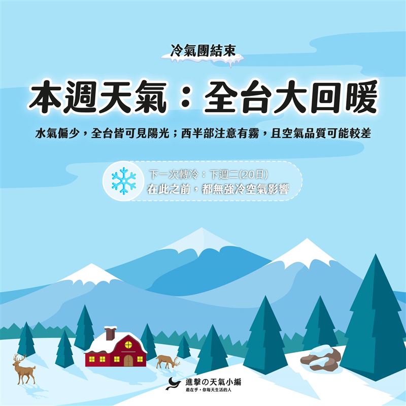 氣象粉專「進擊の天氣小編」則是發文,本週天氣:全台大回暖。隨著高壓中心東移出海,吹往台灣的風向由「北風」轉為「東風」,溫暖的氣流從海面拂來,我們將迎來「為期一週」的回暖天氣,大家沒聽錯,回暖整整一週。