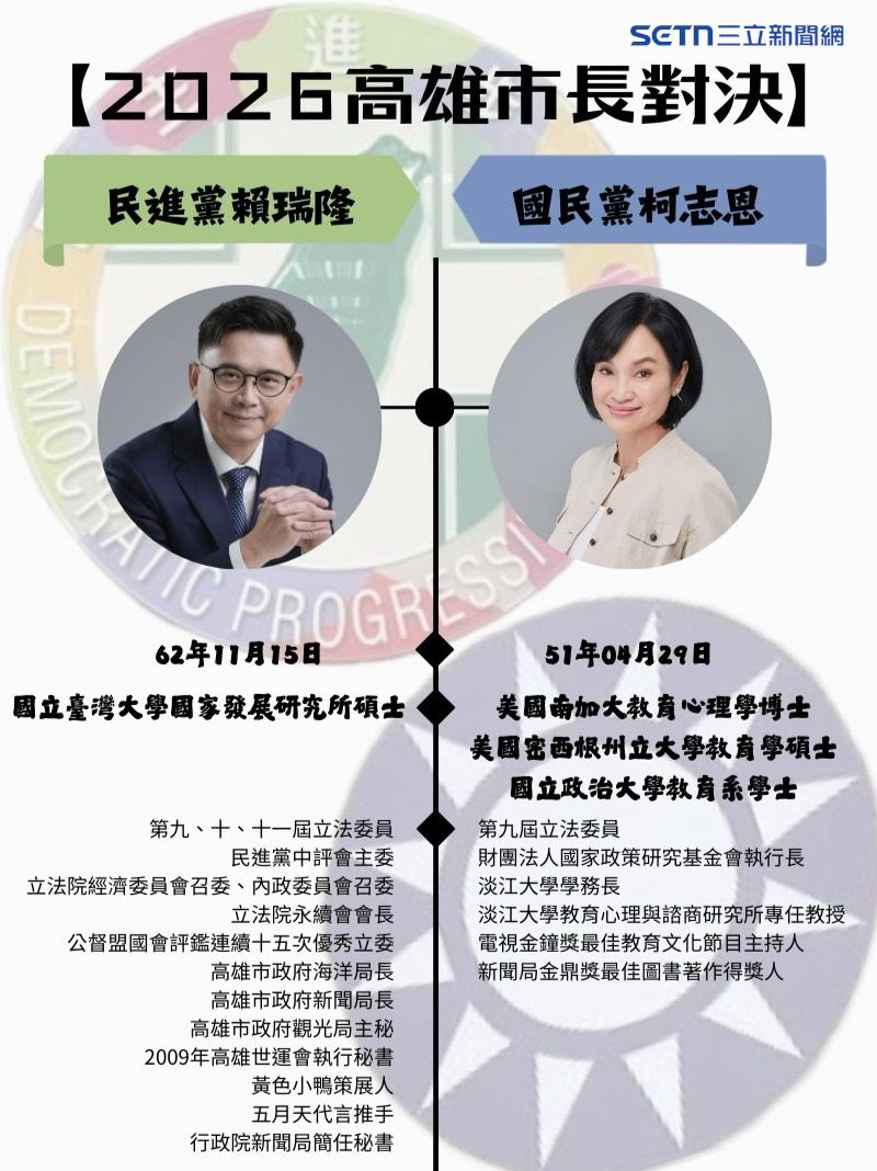 各黨積極佈局2026縣市首長人選,民進黨今(13)日公布高雄市長初選民調,賴瑞隆以0.6%領先邱議瑩,成功出線。民進黨將進行提名程序,預計於下週選對會提報中執會通過。未來賴瑞隆將與代表國民黨參戰的柯志恩一較高下,關於兩人的學經歷也受到關注。對此,《三立新聞網》製作一張對比圖,幫助讀者清楚掌握兩人的背景。