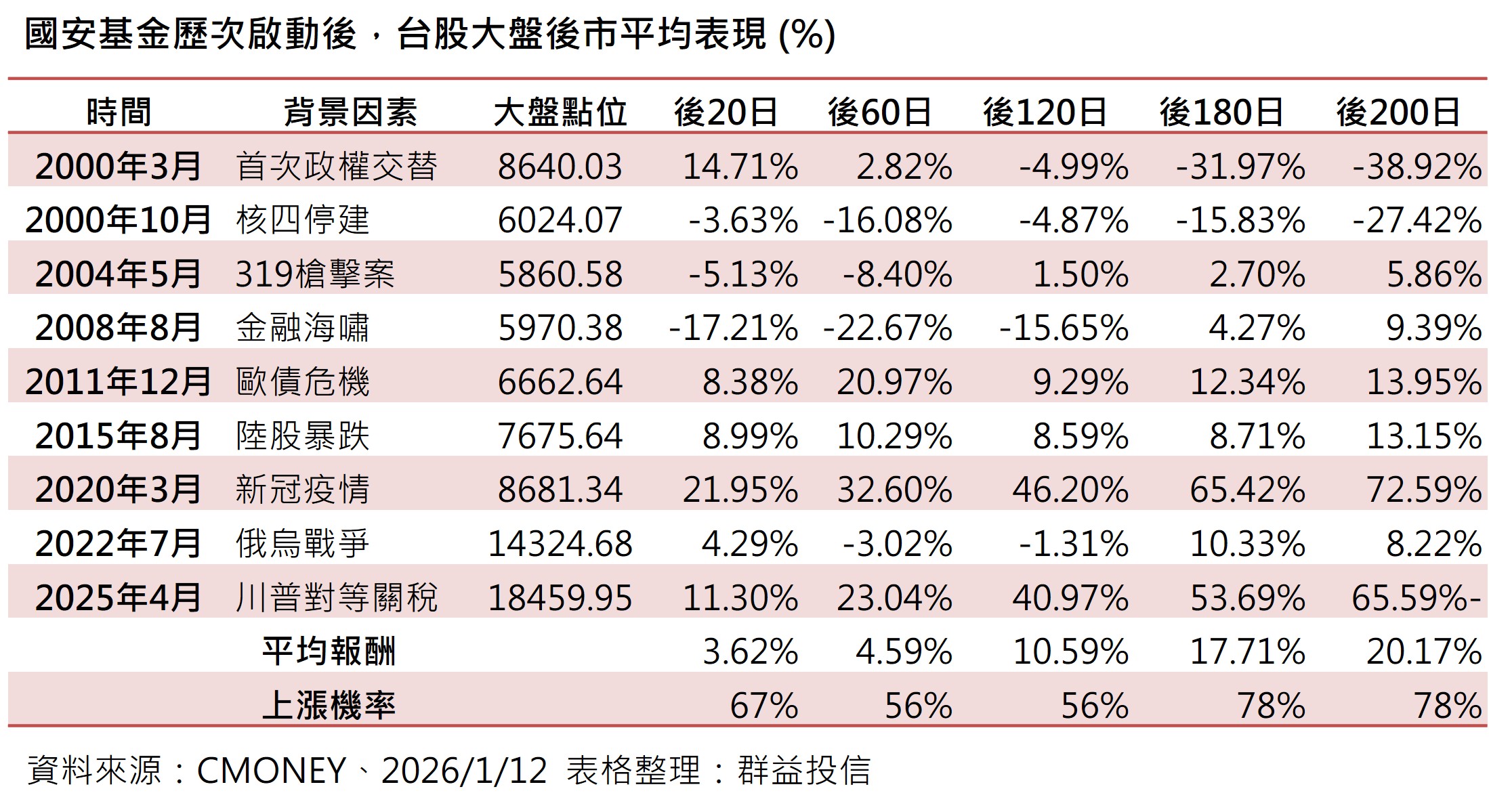 國安基金歷次啟動後,台股大盤後市平均表現(%)。(資料來源:CMONEY、2026/1/12 表格整理:群益投信)