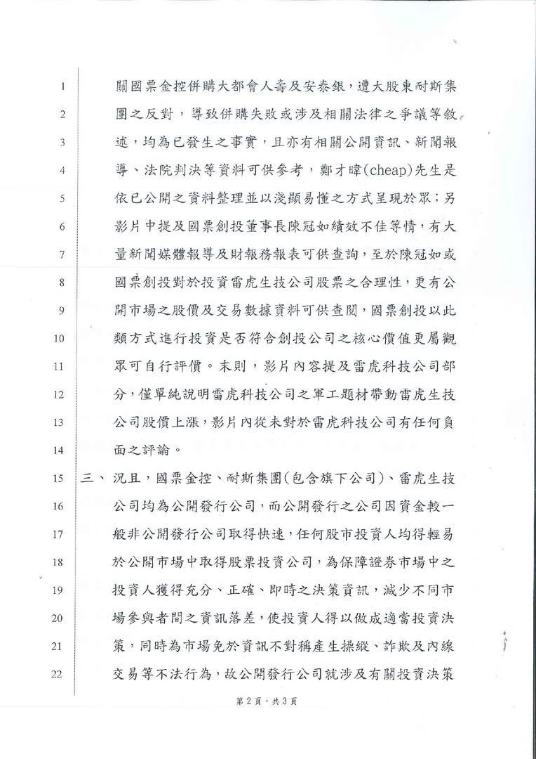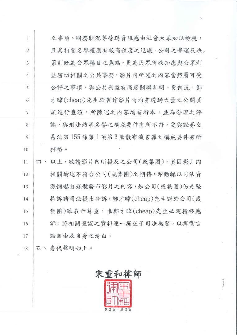 對此,Cheap剛剛發出文章指出「我已正式委任前檢察官、重和國際法律事務所所長 宋重和律師處理,影片裡提到的增資、併購、績效,全部都是公開財報、新聞報導與法院判決,營運狀況本來就是可受公評的公共事務,不是發律師函就能叫人閉嘴。」Cheap強調:「我會積極應訴,法院見」