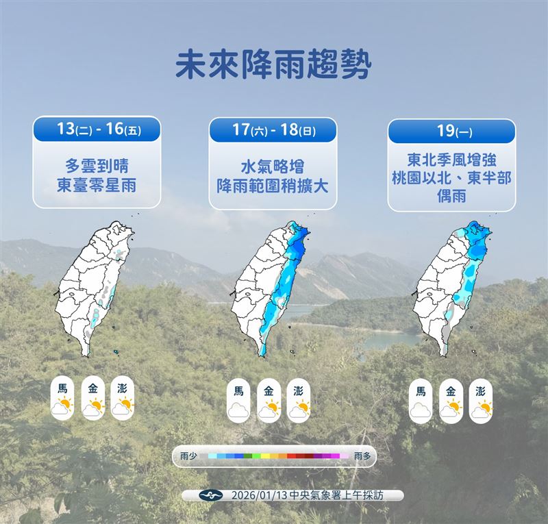 氣象粉專天氣風險指出,週二至週三(13至14日)台灣受大陸冷氣團及環境偏乾影響,各地為晴時多雲天氣;本波冷空氣南侵幅度較小,主要影響北部至東部。預測北部至東部高溫約19至23度,低溫約13至17度。中南部高溫約23至27度,低溫約12至16度。白天日照回溫快,但夜晚清晨再度受輻射冷卻影響,低溫顯著、日夜溫差大,早出晚歸請留意保暖。
