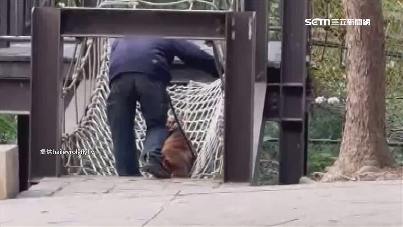 號稱森林探險遊戲場的親子公園,被人直擊傻眼一幕,前方繩索吊橋有一人一犬,狗狗被飼主牽著走,但疑似腿陷入繩索洞裡進退兩難,不僅如此還有更離譜的…