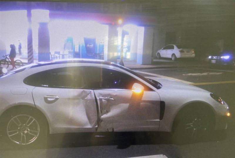 事故發生在昨日晚間6時許,行駛在南山路二段、由勞女駕駛的白色保時捷,準備左轉長安路一段往林口方向前進,已經過了1/2個路口,對向直行的摩托車疑似反應不及,黃姓騎士連人帶車撞擊保時捷的右後車門,現場響起巨大撞擊聲,黃男當下摔落地面,躺在馬路上一動也不動。