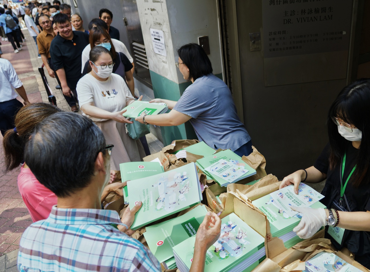 香港市民去年9月在灣仔民政諮詢中心外排隊,等著領取行政長官2025年施政報告。(中新社資料照片)