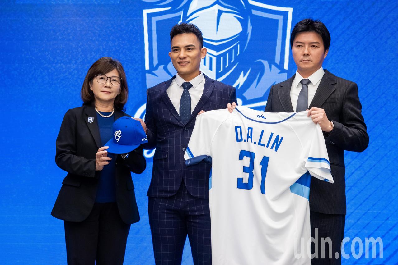 林岱安在今天記者會上穿上過去熟悉的31號,只不過球衣顏色從橘轉藍。除了富邦悍將領隊陳昭如、執行副領隊林威助外,新任一軍總教練後藤光尊也到場。