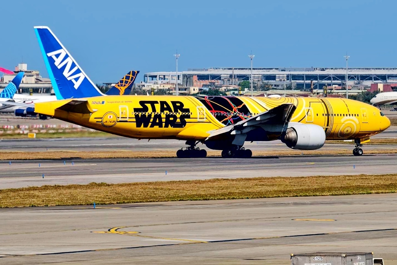 桃園國際機場公司日前在臉書(Facebook)發文表示,由全日空(ANA)與星際大戰合作打造的彩繪機C-3PO ANA JET(機身編號JA743A),推出以來深受航空迷喜愛,可愛的黃色塗裝被暱稱為「たくあん(醃蘿蔔)」。原本預計12日抵台航班,因機務問題延誤到14日才來台。中央社