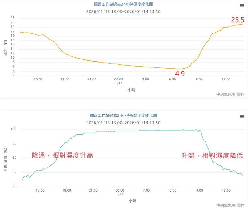 鄭明典表示,隨著太陽升起後,氣溫快速回升,中午過後不久,關西工作站就出現25.5度高溫,單日高低溫差超過20度。他也補充說,在內陸地區單日溫差甚至可能超過40度,但台灣屬海洋性氣候區,日夜溫差大於20度仍屬少見。