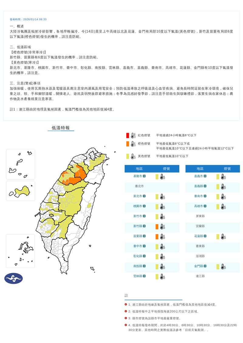 受到大陸冷氣團及輻射冷卻影響,各地早晚偏冷。中央氣象署今(14)日上午6時33分針對「16縣市」發布低溫特報,清晨至上午高雄以北及花蓮、金門有局部10度以下氣溫(黃色燈號),新竹及苗栗有局部6度以下氣溫(橙色燈號)發生的機率。