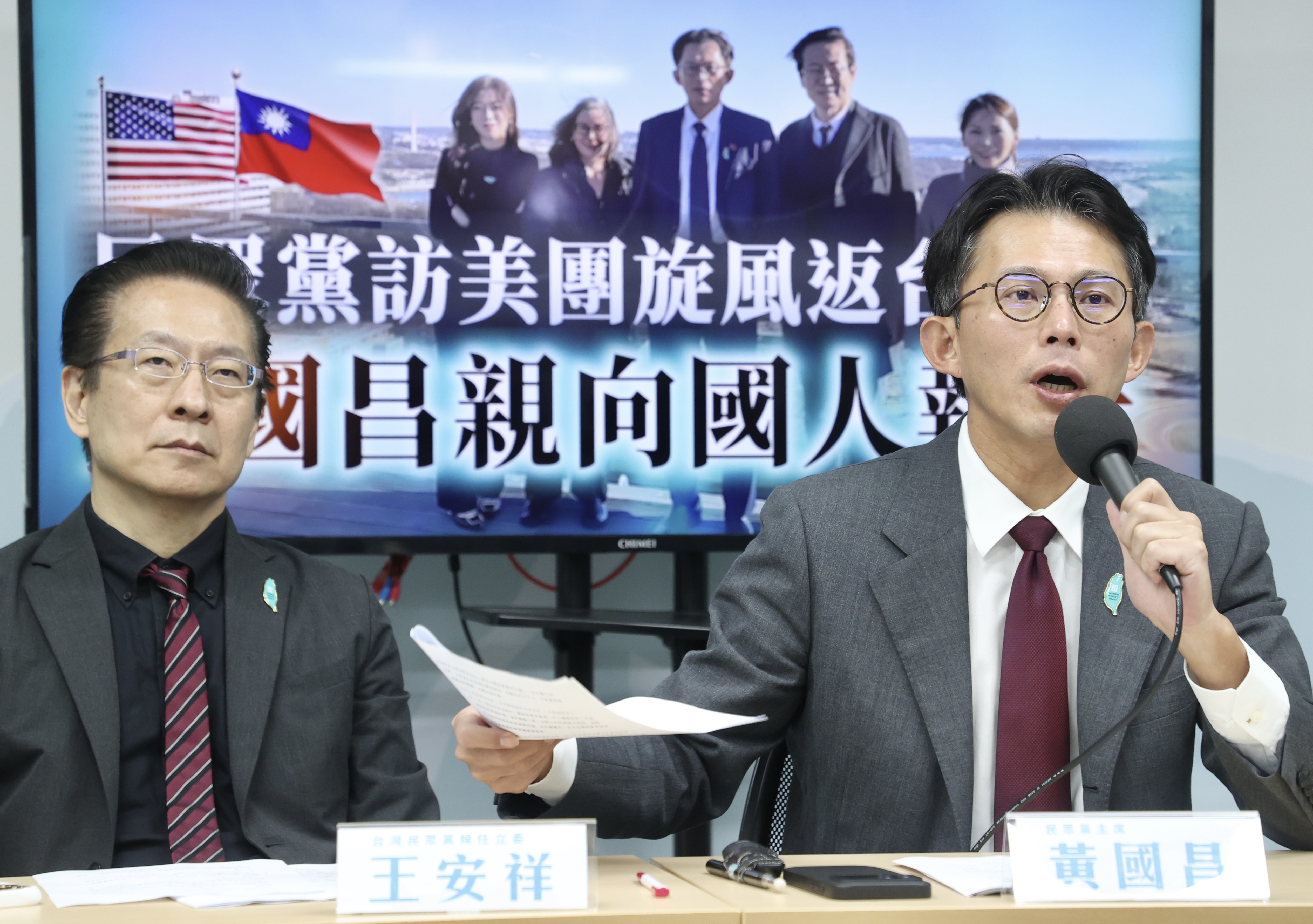 民眾黨主席黃國昌(右)率團出發閃電訪美,在美國停留不到18小時後又隨即返國,今天與訪美的民眾黨成員後任立委王安祥(左)等舉行記者會,這次訪美主要表達對於1.25兆國防特別預算所面對的問題,他重複強調此行所了解,這1.25兆並不全是對美軍購。記者林俊良/攝影