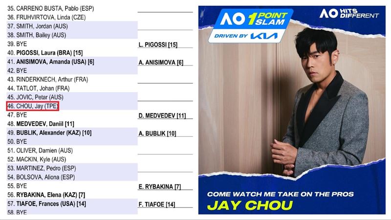 「亞洲天王」周杰倫14日參加澳網1分大滿貫(1 Point Slam),網傳他在籤表上的國籍不是「TPE」而是「CHN」,但看澳網官方微博帳號,周杰倫的國籍是「TPE」。