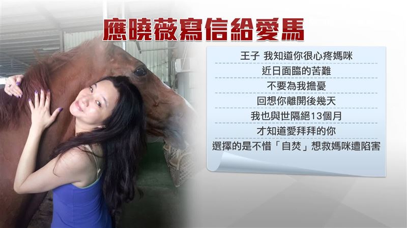 前飼主出面澄清,應曉薇是與朋友合資共50萬「收養」待退老馬,應曉薇也在14日寫了封信給愛馬「王子」,不只喊話不要為自己擔憂,還說王子是不惜「自焚」救媽咪遭陷害。但飼主突然大動作開記者會,就連採訪通知還是透過應曉薇媒體群組發出,也被質疑選在京華城案3/26一審判決出爐前,是別有目的。