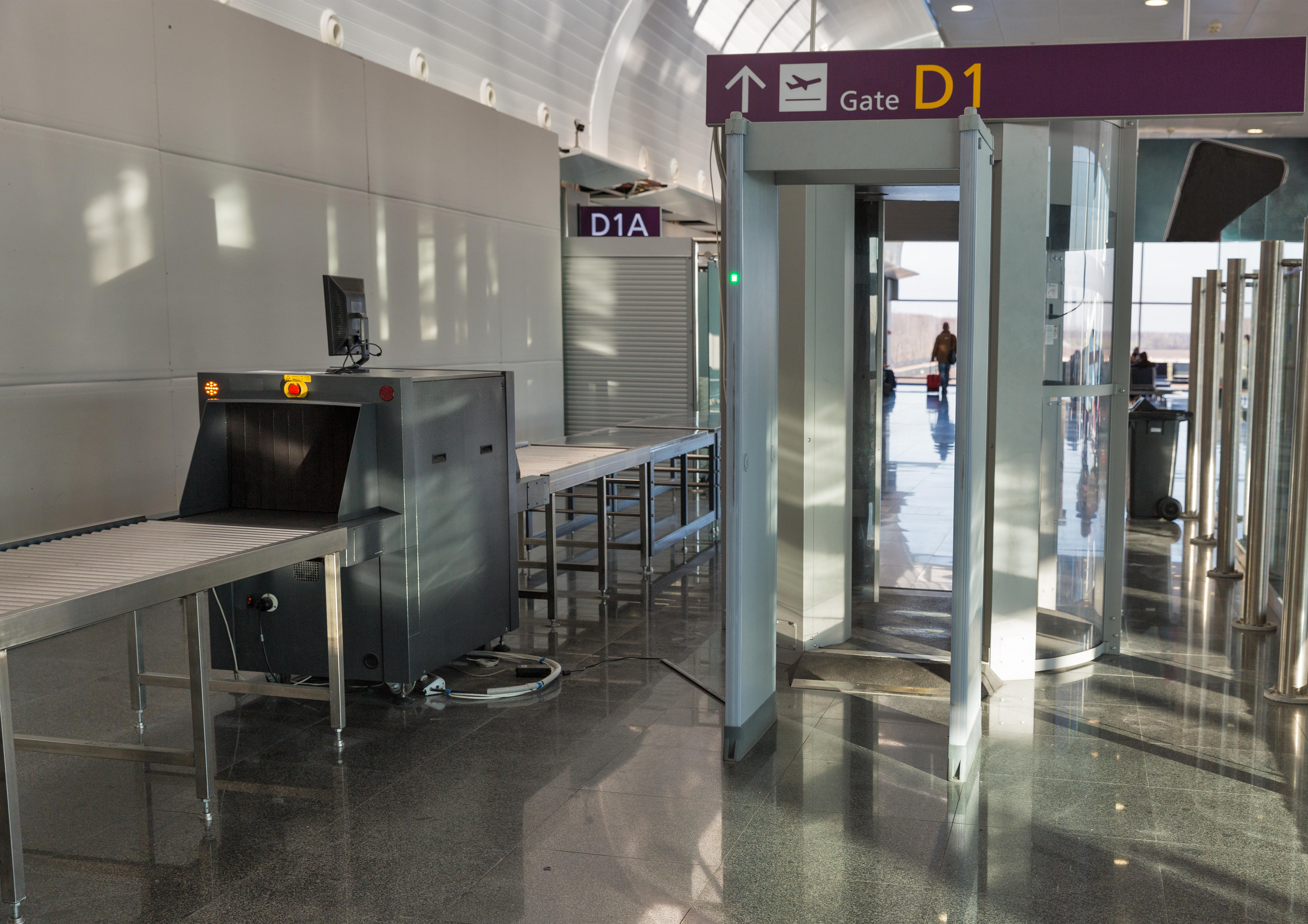 西班牙特內里費南部機場近日發生一起離奇事件,一名80歲男子試圖推著已死亡的妻子登機,但在通過安檢時,被察覺異狀的工作人員攔下。圖為示意圖,一個機場安檢門。路透