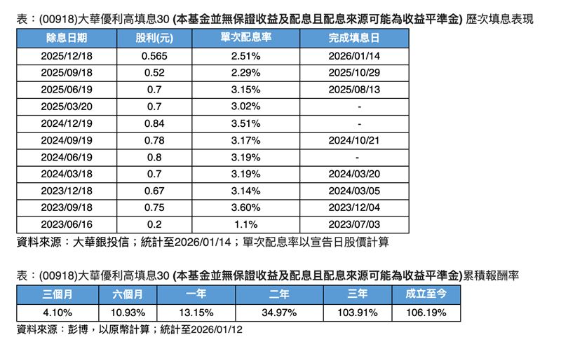 在台股衝上3萬點大關、市場普遍擔心高股息ETF是否陷入領了股息卻賠了價差的疑慮時,持有大華優利高填息30(00918)(本基金並無保證收益及配息且配息來源可能為收益平準金)的投資人,今日迎來了最踏實的一份成績單。00918於1月14日收盤價順利站上23.07元,僅耗時17個交易日便達成連續3季度成功填息。這種領得安心且賺得開心的成就感,不僅強化了長期存股族的信賴,更證明了高配息與高成長在優質篩選機制下確實可以兼得。