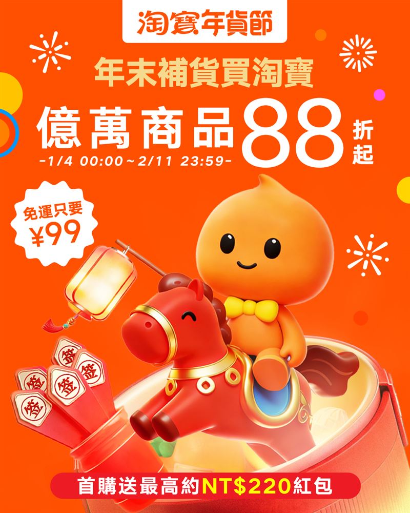 農曆新年進入倒數階段,年節贈禮還沒準備好?2026年淘寶年貨節正式開跑!即日起至2月11日23:59,全站商品享官方立減88折起,並同步疊加多家信用卡優惠,搶先開啟馬年開春第一波超值優惠,至2月1日前還有機會搶到折扣碼與支付立減券!為提升購物便利性,滿人民幣99元即可享免運,也能選擇7-ELEVEN貨到付款服務。