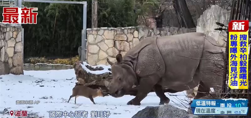 波蘭弗羅茨瓦夫動物園(Wroclaw Zoo)一名飼養員於8日拍下園內山羌「蒙札克」(Mundzak)與犀牛「瑪魯斯卡」(Maruska)的互動畫面,分享至社群平台IG並幽默寫道,「有人今天忘了照鏡子吧!向母犀牛瑪魯斯卡的耐心致敬。」