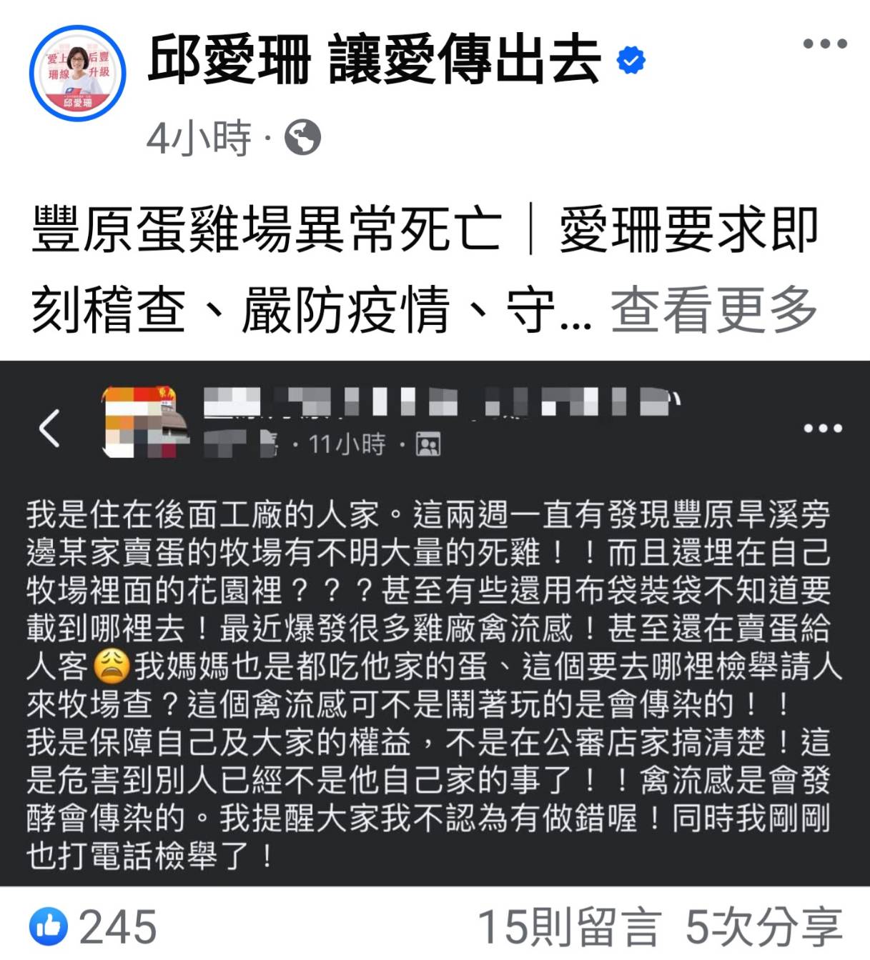 台中市議員邱愛珊今晚說,豐原有蛋雞場異常死亡,她要求即刻稽查、嚴防疫情、守護市民食安。圖/取自邱愛珊臉書