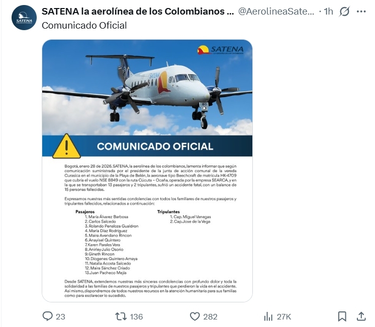 哥倫比亞一架小型商用飛機1月28日在該國東北部飛行時失去聯繫,已證實機上15人全數罹難。圖擷自X@AerolineaSatena