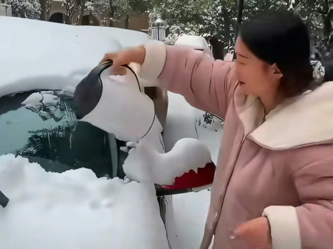 《極目新聞》報導,網傳影片顯示,涉事女子自稱有人說把熱開水倒在被厚雪覆蓋的汽車擋風玻璃上,會令玻璃炸開。好奇之下,她也燒了開水到停車場做實驗,將滾水淋在積雪達7、8厘米厚的紅色汽車的「大銀幕」上,積雪隨熱水淋下而融化。