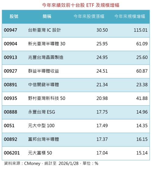 台股2026年來不斷上演創天價驚喜,帶動台股ETF凌勵漲勢,據統計,今年來績效前十強的台股ETF不僅漲幅皆高達二位數以上,規模成長率亦同步達二位數。其中,台新臺灣IC設計(00947)受惠於兩大強勢成份股記憶體及IC設計大漲帶動,今年來股價大漲逾三成,不到一個月規模翻倍,表現最為亮眼。法人表示,近期記憶體及IC設計族群表現亮眼,投資人布局相關持股比重高的台股ETF可一網打盡熱門個股,也不怕處置或漲停時買不到相關個股,ETF便利的投資方式也成為參與記憶體行情的熱門選擇。