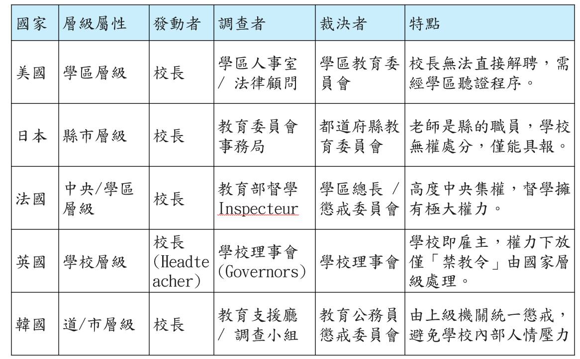 例如,日本由縣級教育委員會負責調查,美國由學區聘請專業律師與人資單位處理,法國由國家督學獨立視導,韓國則由教育廳層級的教育公務員懲戒委員會統一處理。