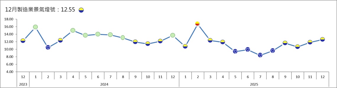台經院今日發布去年12月製造業景氣燈號,因AI及雲端服務等應用商機強勁、川普關稅政策影響逐漸淡化,AI相關產業表現強勁,惟非AI相關製造業仍待復甦,去年12月製造業整體景氣信號值增加0.73分至12.55分,景氣燈號連四個月亮出代表景氣低迷的黃藍燈。