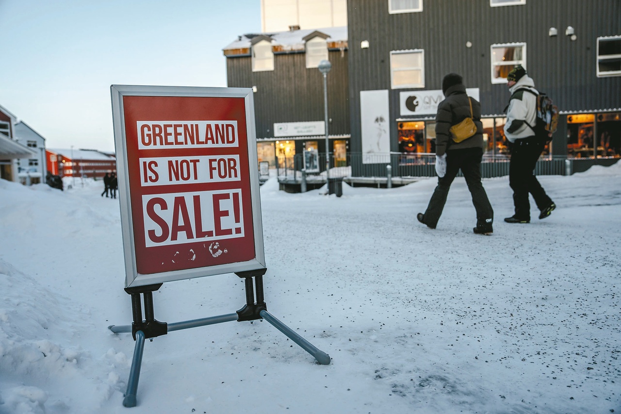 民眾走過格陵蘭首府努克街頭,一面紅色立牌寫著「格陵蘭是非賣品」。歐新社