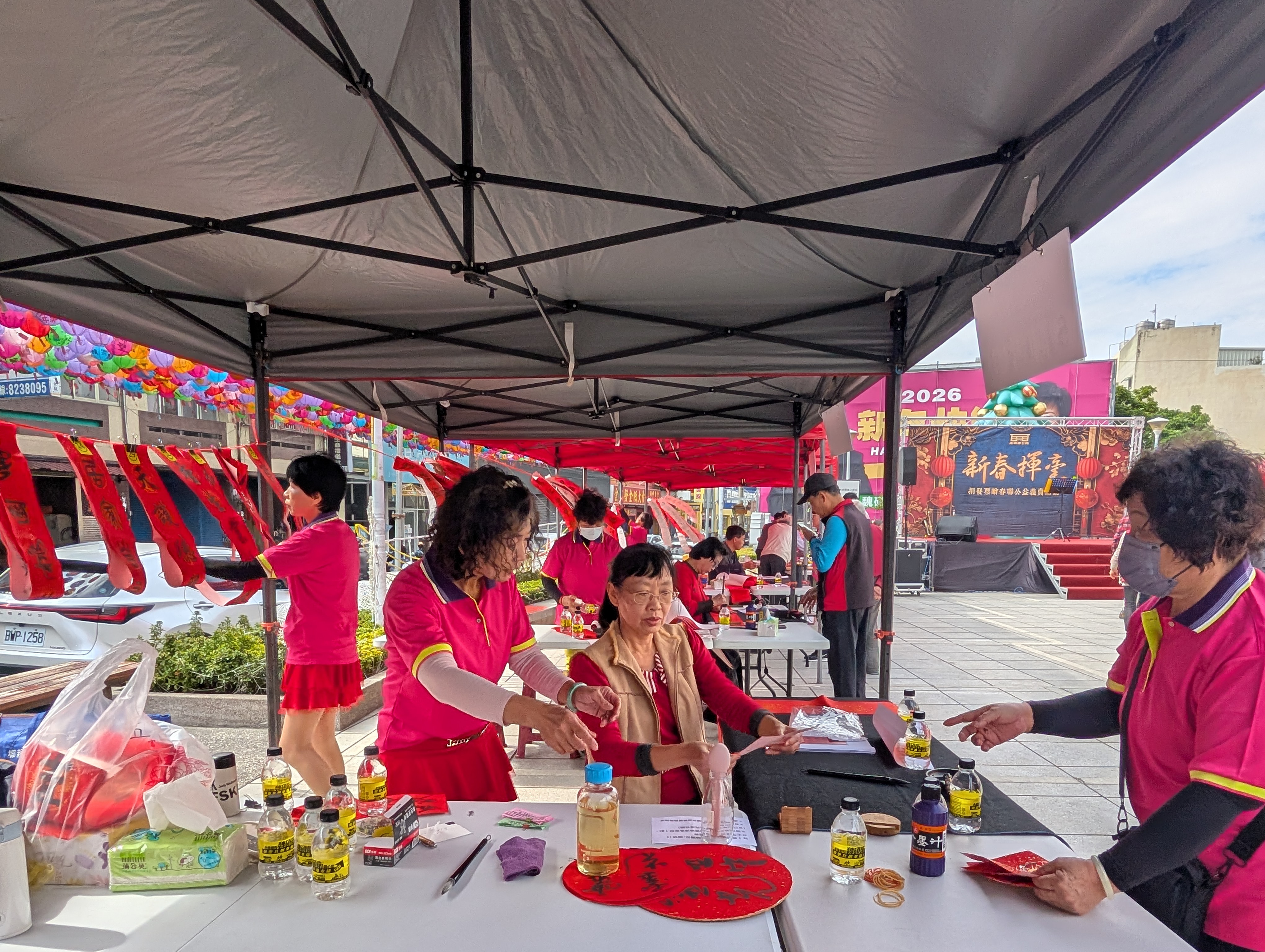 永靖鄉公所在鄉公所前廣場,舉辦115年新春揮毫捐發票贈春聯暨公益義賣活動,邀請沈宗儒、劉建居等16名書法名家揮毫。前兩年鄉公所各送出600多幅、800多幅門聯,怎麼送都不夠,鄉公所被抱怨,今年改採捐今年1月紙本或雲端發票兩張,即可兌換1幅門聯,發票全數捐贈華山基金會等社福團體。