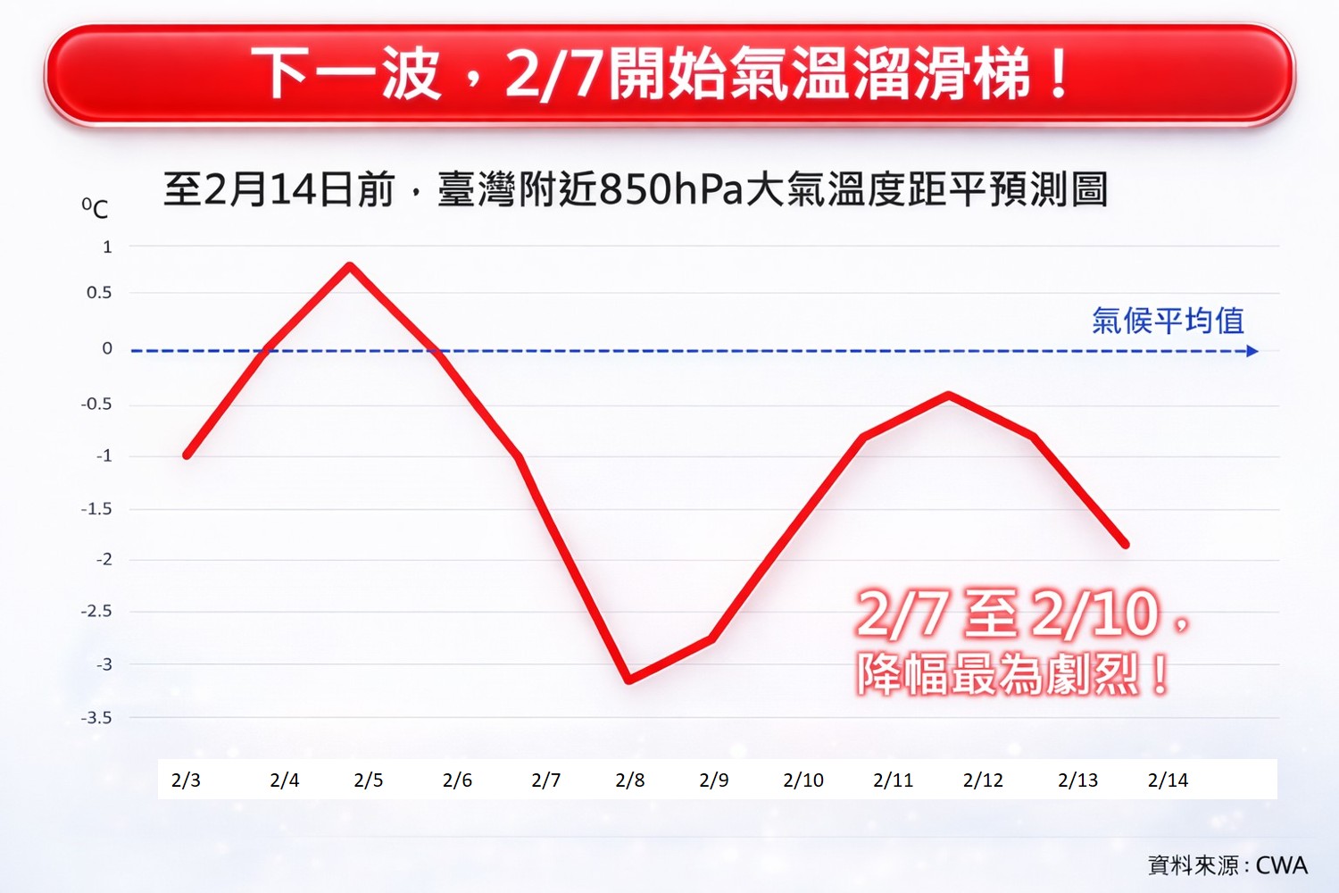 還沒冷完,氣象專家林得恩今天在「林老師氣象站」臉書粉專估下一波冷空氣時間點,他說,2月7日開始氣溫溜滑梯,2月7日至10日氣溫降幅最劇烈。