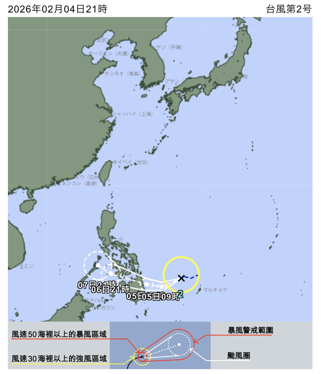 根據日本氣象廳最新資訊,位於菲律賓東方海面的熱帶性低氣壓,今晚增強為今年第2號颱風「西望洋」(Penha)。氣象署表示,颱風未來將朝西,往菲律賓南部移動,對台灣無直接影響。