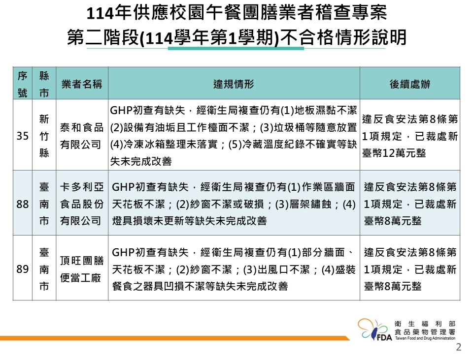 除新竹縣泰和食品有限公司,共5項違規挨罰12萬,台南市卡多利亞食品股份有限公司,作業區牆面天花板不潔、紗窗不潔或破損、層架鏽蝕、燈具損壞未更新等,且未完成改善,被依「食安法」第8條開罰,裁處新台幣8萬元罰鍰。台南市頂旺團膳便當工廠部分牆面及天花板不潔、紗窗不潔、出風口不潔、承裝餐食器具凹損不潔,也被開罰新台幣8萬元罰鍰。