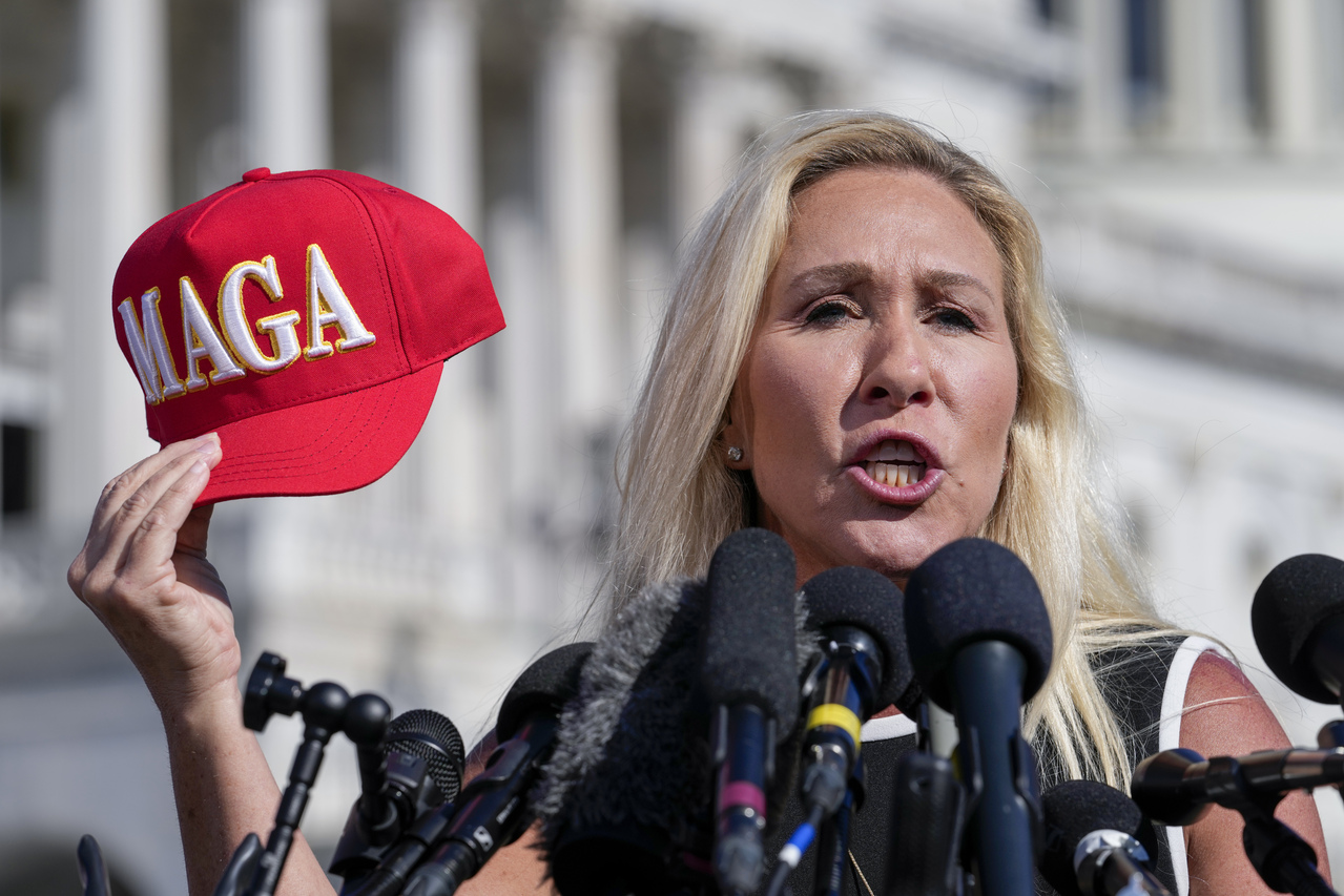 前共和黨籍聯邦眾議員格林(Marjorie Taylor Greene)昔日曾是川普盟友,一直高舉MAGA大旗。 (美聯社資料照片)