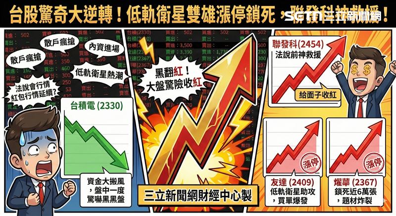 台股今(4)日開盤一度讓投資人驚出一身冷汗,隨著台積電走勢疲軟,大盤指數早盤陷入震盪黑盤,市場氣氛一度凝重。沒想到午盤過後,資金流向出現劇烈大搬風,低軌衛星概念股全面噴發,權值股聯發科也趕在法說會前夕強勢表態,大盤戲劇性地「黑翻紅」,終場收在32289.81點,上漲94.45點,驚險守住紅盤。