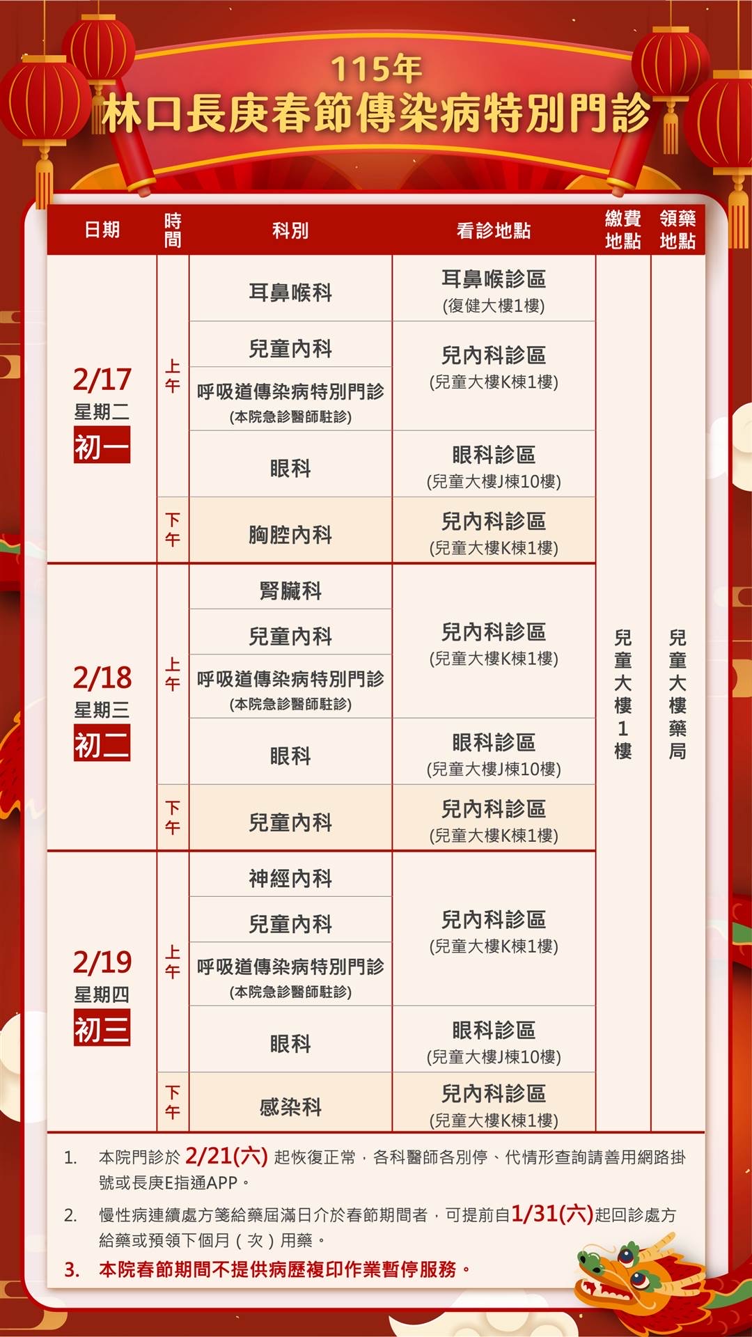 今年春節長達9天,林口長庚紀念醫院因應民眾就醫需求,2月17日(農曆初一)至19日(農曆初三)開設「春節傳染病特別門診」,分流輕症病患,同時也提供24小時門診靜脈抗生素治療(OPAT),呼籲民眾善加利用。