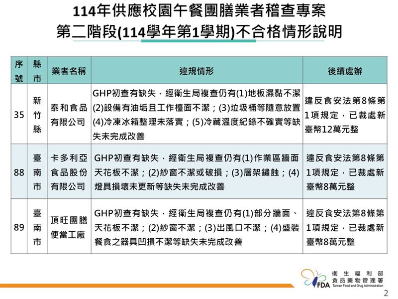 其中,不合格業者包括新竹縣「泰和食品有限公司」,GHP初查有缺失,經衛生局複查仍有地板濕黏不潔、設備有油垢且工作檯面不潔、垃圾桶等隨意放置、冷凍冰箱整理未落實、冷藏溫度紀錄不確實等缺失未完成改善,已經依違反食安法裁處新台幣12萬元。台南市「卡多利亞食品股份有限公司」,GHP初查有缺失,經衛生局複查仍有作業區牆面天花板不潔、紗窗不潔或破損、層架鏽蝕、燈具損壞未更新等缺失未完成改善;台南市「頂旺團膳便當工廠」,GHP初查有缺失,經衛生局複查仍有部分牆面、天花板不潔;紗窗不潔、出風口不潔、盛裝餐食之器具凹損不潔等缺失未完成改善,分別已裁處8萬元。