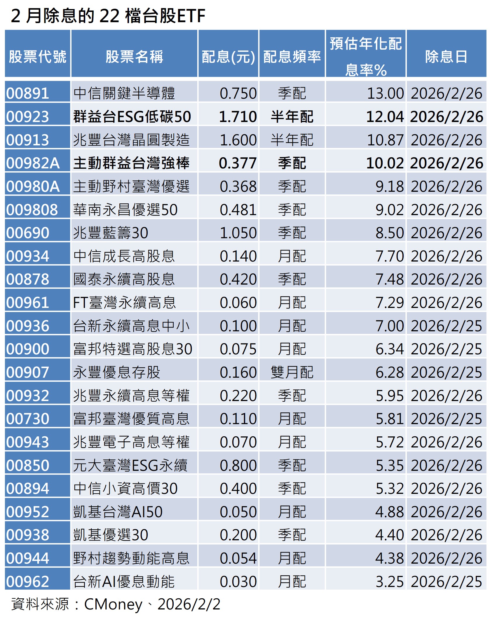 2月除息的22檔台股ETF。(資料來源:CMoney、2026/2/2)